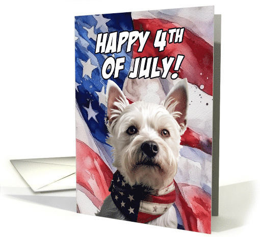 Artist Notes: | A patriotic West Highland White Terrier dressed in stars and stripes on an American flag watercolor background with the text 'Happy 4th of July!'. The perfect card to send to for a Westie mom or dad to celebrate the birthday of America. |