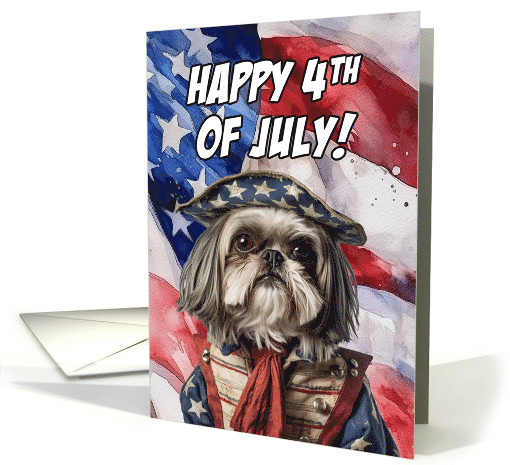Artist Notes: | A patriotic Shih Tzu dressed in stars and stripes on an American flag watercolor background with the text 'Happy 4th of July!'. The perfect card to send to for a Shih Tzu mom or dad to celebrate the birthday of America. |