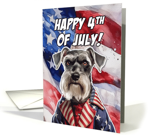 Artist Notes: | A patriotic Schnauzer dressed in stars and stripes on an American flag watercolor background with the text 'Happy 4th of July!'. The perfect card to send to for a Schnauzer mom or dad to celebrate the birthday of America. |