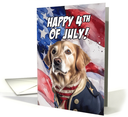 Artist Notes: | A patriotic Golden Retriever dressed in stars and stripes on an American flag watercolor background with the text 'Happy 4th of July!'. The perfect card to send to for a Golden Retriever mom or dad to celebrate the birthday of America. |