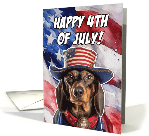 Artist Notes: | A patriotic Dachshund dressed in stars and stripes on an American flag watercolor background with the text 'Happy 4th of July!'. The perfect card to send to for a Dachshund mom or dad to celebrate the birthday of America. |