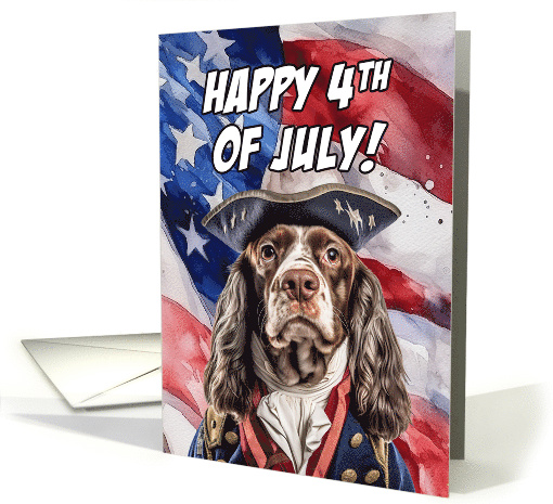 Artist Notes: | A patriotic Cocker Spaniel dressed in stars and stripes on an American flag watercolor background with the text 'Happy 4th of July!'. The perfect card to send to for a cocker spaniel mom or dad to celebrate the birthday of America. |