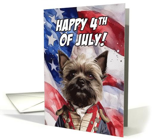 | Artist Notes: | A patriotic Cairn Terrier dressed in stars and stripes on an American flag watercolor background with the text 'Happy 4th of July!'. The perfect card to send to for a cairn terrier mom or dad to celebrate the birthday of America. |