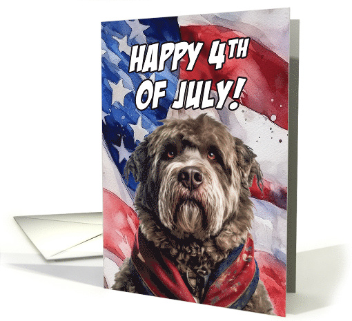 | Artist Notes: | A patriotic Bouvier dressed in stars and stripes on an American flag watercolor background with the text 'Happy 4th of July!'. The perfect card to send to for a bouvier mom or dad to celebrate the birthday of America. |