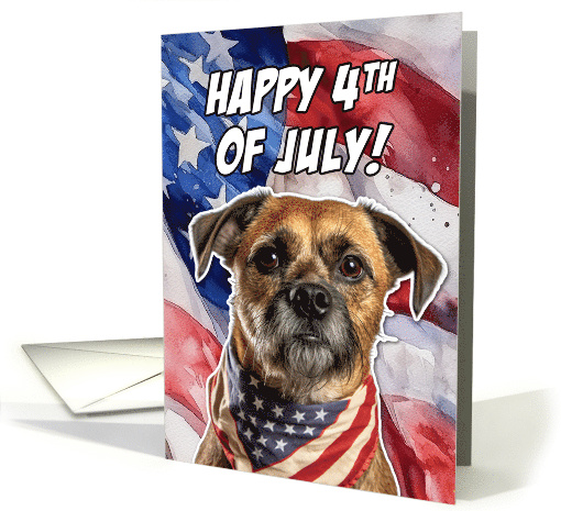 | Artist Notes: | A patriotic Border Terrier dressed in stars and stripes on an American flag watercolor background with the text 'Happy 4th of July!'. The perfect card to send to for a border terrier mom or dad to celebrate the birthday of America. |