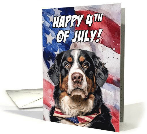 Artist Notes: | A patriotic Bernese Mountain dog dressed in stars and stripes on an American flag watercolor background with the text 'Happy 4th of July!'. The perfect card to send to for a bernese mountain dog mom or dad to celebrate the birthday of America. |