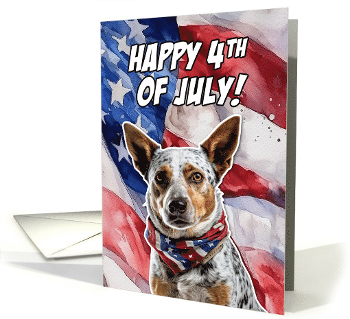 | Artist Notes: | A patriotic Australian Cattle dog dressed in stars and stripes on an American flag watercolor background with the text 'Happy 4th of July!'. The perfect card to send to for an aussie cattle dog mom or dad to celebrate the birthday of America. |