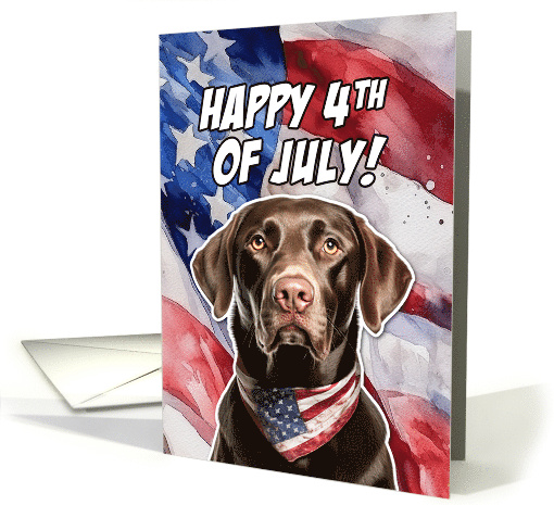 Artist Notes: | A patriotic Labrador Retriever dog dressed in stars and stripes on an American flag watercolor background with the text 'Happy 4th of July!'. The perfect card to send to for an labrador retriever mom or dad to celebrate the birthday of America. |