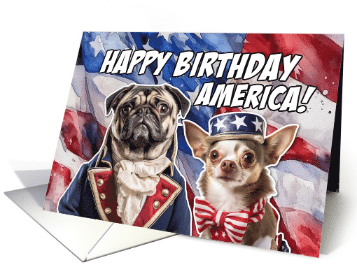 | Artist Notes: | A patriotic pug and chihuahua are dressed in stars and stripes on a grungy American flag watercolor background with the text 'Happy Birthday America'. The perfect celebrational card to send to your friends and family. |