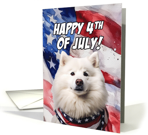 | Artist Notes: | A patriotic Samoyed dressed in stars and stripes on an American flag watercolor background with the text 'Happy 4th of July!'. The perfect card to send to for a samoyed mom or dad to celebrate the birthday of America. |