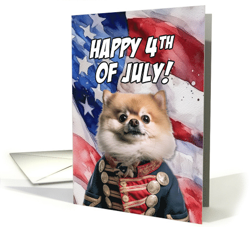 Artist Notes: | A patriotic Pomeranian dressed in stars and stripes on an American flag watercolor background with the text 'Happy 4th of July!'. The perfect card to send to for a pomeranian mom or dad to celebrate the birthday of America. |