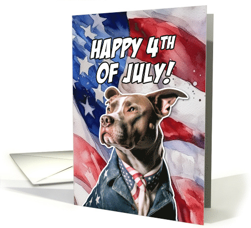 | Artist Notes: | A patriotic Pitbull dressed in stars and stripes on an American flag watercolor background with the text 'Happy 4th of July!'. The perfect card to send to for a pittie mom or dad to celebrate the birthday of America. |