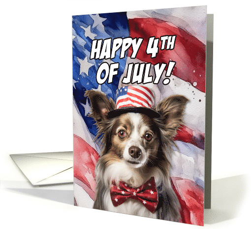 | Artist Notes: | A patriotic Papillon dressed in stars and stripes on an American flag watercolor background with the text 'Happy 4th of July!'. The perfect card to send to for a papillon mom or dad to celebrate the birthday of America. |