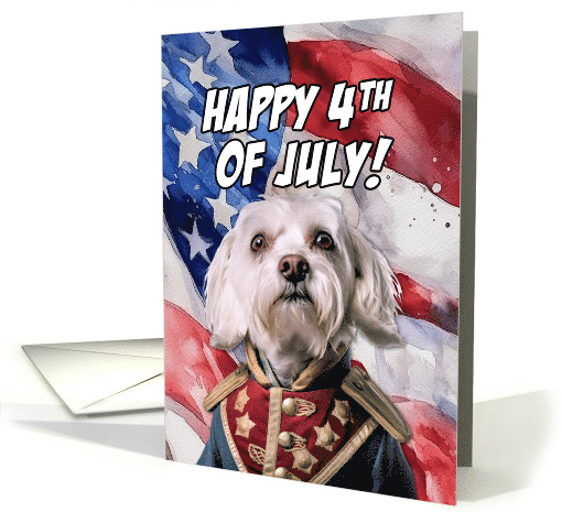 Artist Notes: | A patriotic Maltese dressed in stars and stripes on an American flag watercolor background with the text 'Happy 4th of July!'. The perfect card to send to for a maltese mom or dad to celebrate the birthday of America. |
