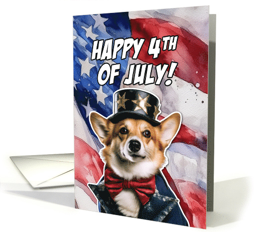 Artist Notes: | A patriotic Pembroke Welsh Corgi dressed in stars and stripes on an American flag watercolor background with the text 'Happy 4th of July!'. The perfect card to send to for a corgi mom or dad to celebrate the birthday of America. |