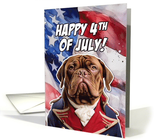 | Artist Notes: | A patriotic Bordeaux Dog dressed in stars and stripes on an American flag watercolor background with the text 'Happy 4th of July!'. The perfect card to send to for a bordeaux dog mom or dad to celebrate the birthday of America. |