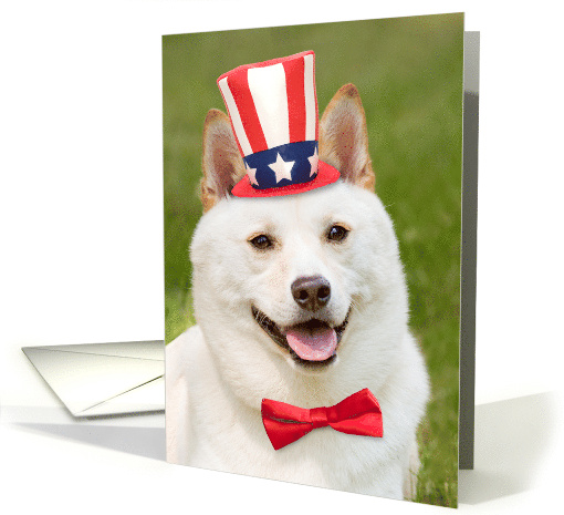 | Artist Notes: | Send this patriotic, smiling, furry face of a Shiba Inu dog in an Uncle Sam hat with a red bow tie to send a smile and say Happy Fourth of July! |