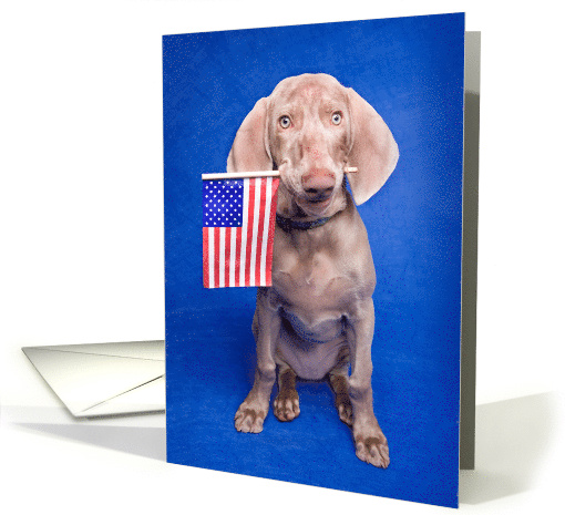 Send this adorable Weimaraner puppy holding a USA flag in his mouth to say Happy Fourth of July in a very cute way!