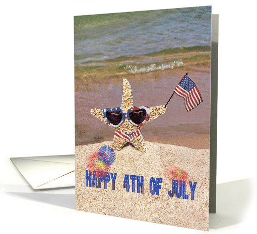 | Title: | Happy 4th of July starfish on the beach with American flag |