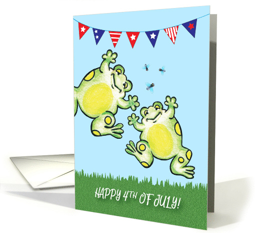 | Artist Notes: | Give this fun card to friends and family for the 4th of July. The cover features my two happy frogs jumping, three flies, a light blue sky, a patriotic bunting, and a white headline on green grass. The inside message may be changed, if you wish. ©Gail Pepin |