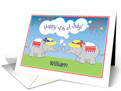 | Artist Notes: | Give this custom name card to someone special for 4th of July. The cover features my 2 happy elephants wearing straw hats and red, white, and blue designed blankets. They are puffing a fluffy white cloud where the blue headline is located. Fireworks are going off in the background. A white border and inner red border finish the design. The inside message may be changed to fit your needs. ©Gail Pepin |