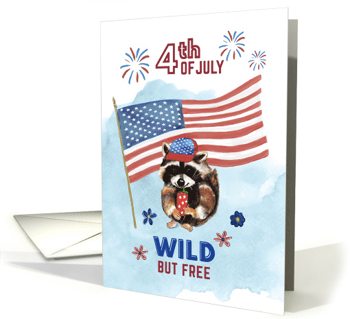 | Artist Notes: | A cute and whimsical 4th of July card featuring a raccoon wearing a red and blue cap inspired by the American flag. The raccoon is sipping a patriotic drink from a can with a straw, set against a light blue background with drawn fireworks and a waving American flag. Bold festive text reads "4th of July" at the top and “Wild but free” at the bottom. A cheerful design to celebrate Independence Day with charm and personality. |