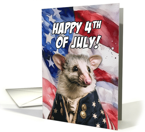 | Artist Notes: | A patriotic Opossum dressed in stars and stripes on an American flag watercolor background with the text 'Happy 4th of July!'. The perfect card to send to a opossum mom or dad, a sanctuary or a rescue center to celebrate the birthday of America. |