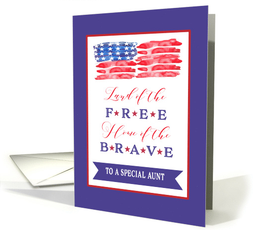 | Artist Notes: | Wish your special aunt a Happy Fourth of July with this modern card in the colors red, white and blue. Text front of card: Land of the Free and Home of the Brave. Watercolor stripes and white and red stars. You can personalize and change all text inside the card. |