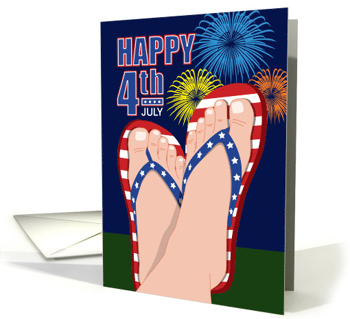Artist Notes: | 4th of July greeting with person relaxing and wearing patriotic flip flops with stars and stripes while watching the fireworks in the night sky. |