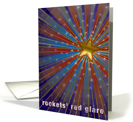 Artist Notes: | Celebrate the red, white and blue with this bold fireworks inspired card for the 4th of July. A gold-colored star twinkles as bursts of color splash through the deep blue night sky, reminding us of "rockets' red glare," the founding of the United States of America. |