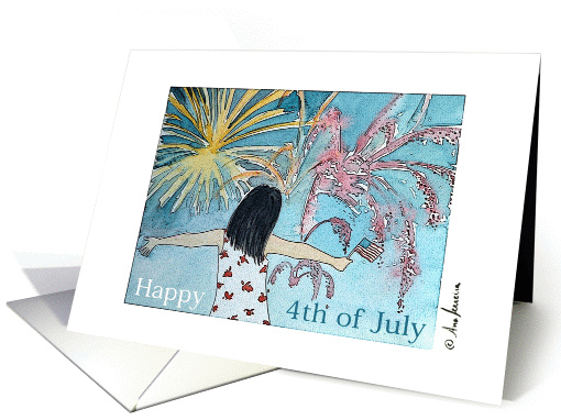 Title: | Happy 4th of July girl with American flag watching fireworks |