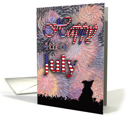 Title: | Happy 4th of July, Stars and Stripes against Firework Sky with Dog |