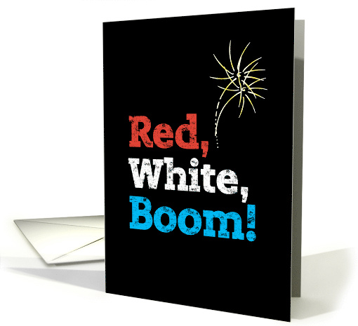 Celebrate July 4th with a bang--and a boom-- with this bold and graphic card that declares, "Red, White, Boom!" Typography has intentionally distressed appearance.