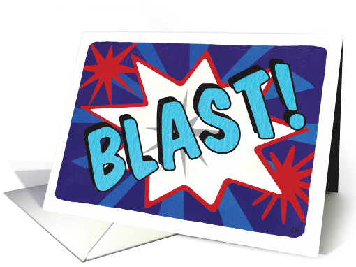 Artist Notes: | Share the joy of Independence Day with this comic book, style greeting card. Bursts of white, gray, red, and blue on a darker blue background and the word BLAST! in light blue and black. The illustration is a digital composite of hand-painted papers. Inside: Have a blast on the 4th of July. |
