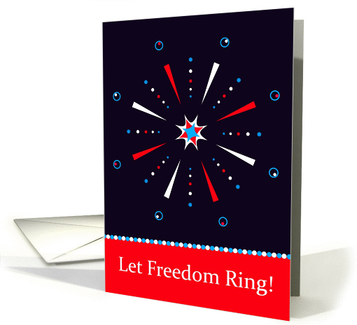 Artist Notes: | July 4th, Let Freedom Ring greeting card features a red white and blue graphic firework illustrated from geometric shapes. Blue and white polka dot line separates dark blue sky from red bar with sentiment. |