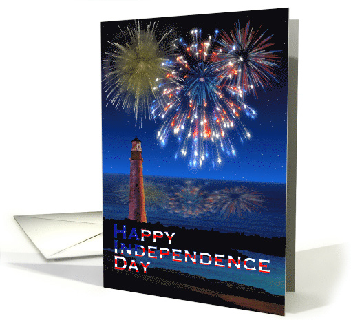 Artist Notes: | Wish them a Happy Independence Day in Old Glory text, with fireworks exploding above the sea and a lighthouse on a starry night! |