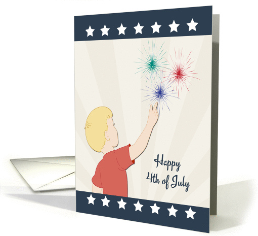 | Artist Notes: | Retro design 4th of July card with cartoon boy pointing to fireworks with sunburst and stars. Cute card for the July 4th holiday. Design © 2015 Julia Bryant. |