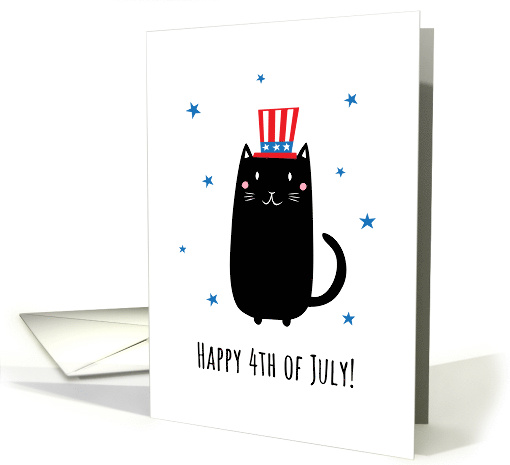 Artist Notes: | Happy fourth of July greeting card featuring a cute, black cat wearing a patriotic hat surrounded by blue stars. Text on front: Happy 4th of July! Suggested text inside: Wishing you a day filled with joy and happiness, good food and great fireworks! |