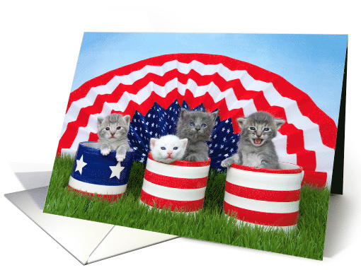 | Artist Notes: | Four adorable little kittens sitting in patriotic canisters in green grass, patriotic fan folded bunting displayed behind them, one kitten "yelling" a message of patriotism to share with your feline loving friends and/or family. |