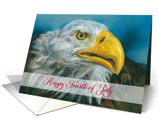 | Artist Notes: | Commemorate US independence with this Fourth of July card embellished with an awesome raptor portrait picturing a majestic bald eagle with sharp looking beak of vivid yellow, white feathers on its head, and a yellow eye with a gleam. The bird is set against a background of blue. |