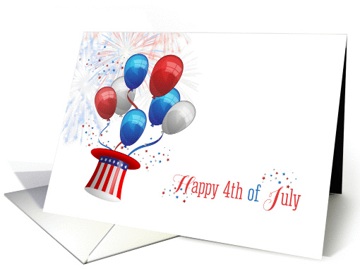 Send July 4th greetings with this festive card featuring red, white and blue balloons in a patriotic top hat on a white background with fireworks.