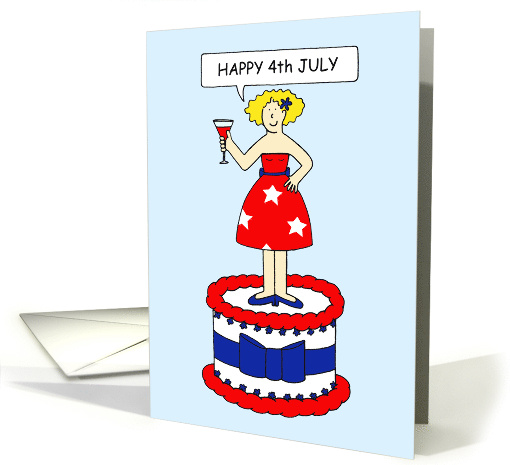 Artist Notes: | Cartoon lady with blonde hair, a red and white dress and blue shoes, stands on top of a red, white and blue cake saying 'Happy 4th July ' and holding a cocktail. Inside, the card says 'Have a wonderful day!'. A funky card to celebrate Independence Day. |