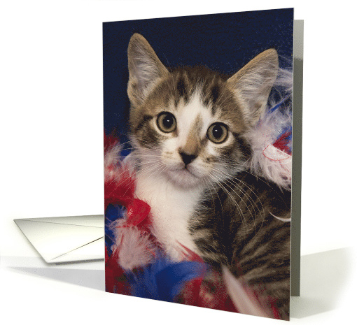 | Title: | Fourth of July Patriotic Tabby Kitten in Red White Blue Feathers |