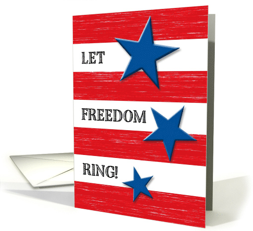 | Artist Notes: | Let Freedom Ring greeting card celebrates the birth of America. This bold and bright 4th of July card features the red, white and blue stars and stripes of the American flag. THE RED STRIPES ON THIS CARD ARE INTENTIONALLY DESIGNED WITH DIGITAL EFFECTS TO LOOK LIKE AGED AND DISTRESSED WOOD. |