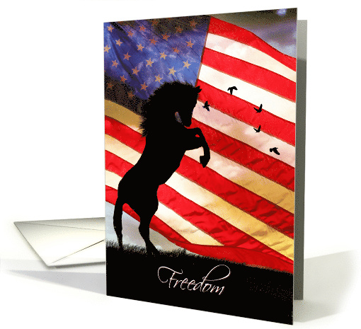 | Artist Notes: | Freedom. It's what the holiday stand from. This fourth of July card has a silhouetted rearing horse and a big American flag with birds. All symbols being free. |