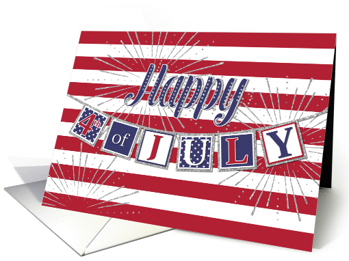 This is a Happy 4th of July Day card featuring the text Happy 4th of July set against a red and white striped background. There are also some star burst decorative elements with a silver sparkle effect overlay which look like celebratory fireworks. Please note that all the silver sparkle effect elements were digitally created. The words 'Happy' is written in a fun script font in blue with some silver sparkle effect dots. The text '4th of JULY' is presented like a banner across the card, with square text areas. The banner design is in red, white and blue, and blue with white stars.. Each square has a silver sparkle effect border. This is a fun and bright design to celebrate American Independence Day incorporating the American flag red white and blue colors. © Natalie Kinnear Cards www.greetingcarduniverse.com/nataliekinnearcards