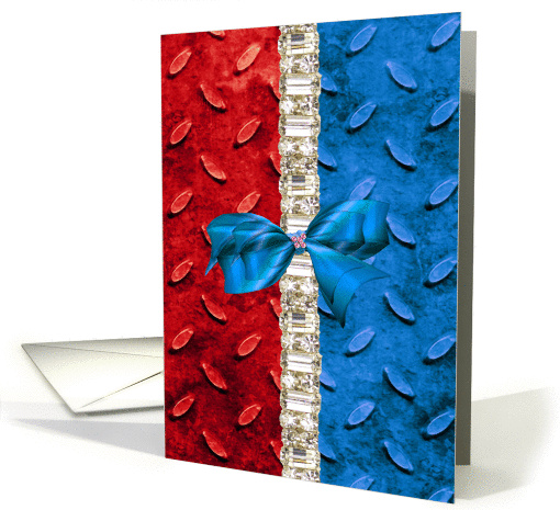 Artist Notes: | Check out this awesome one of a kind faux designed item.. SO Cool....Awesome red & blue metal look background. Next comes a string of faux rhinestones. Than it's topped off with two bows. Personalize it anyway you like... If you need the card to say something different, drop me an e-mail at |