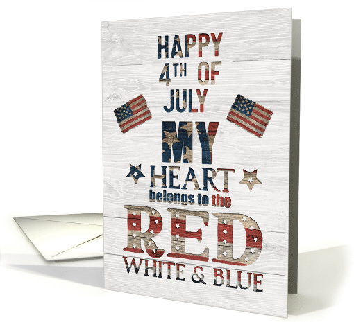 | Artist Notes: | Send a rustic looking Happy 4th of July greeting and to show how proud you are to be an American. A word art design says "My heart belongs to the red, white, and blue." There are 2 American flags and stars on a digitally created wood background. |
