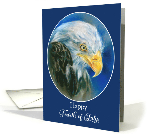 | Artist Notes: | Celebrate liberty and the founding of the USA with this card that features a bald eagle portrait created in soft shades of white and brown accented with blue and framed within an oval on a classic blue backdrop with white text. This bird of prey is the National Bird of the United States of America and also represents freedom. |