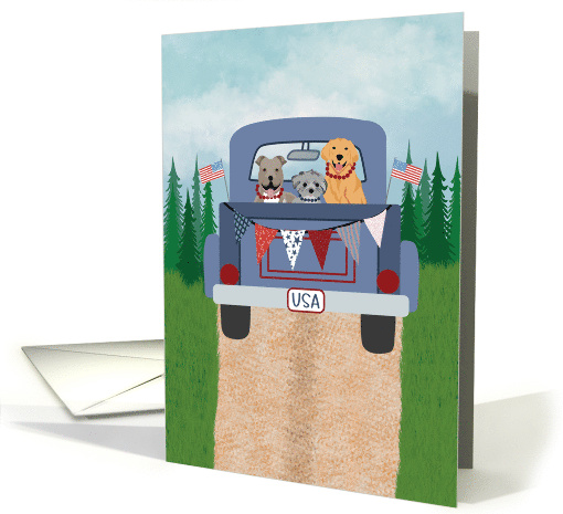 | Artist Notes: | This July 4th card features a charming blue retro truck adorned with a red, white, and blue flag banner, two American flags, and a USA license plate. Inside the bed of the truck, three adorable dogs with beaded collars are loving life. |
